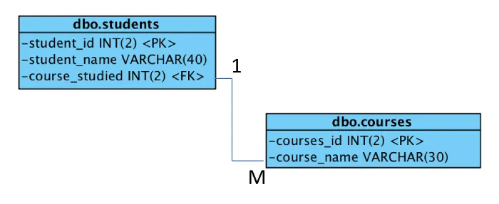 在本教程中,我将构建一个使用如下实体关系图(ERD)中显示的简单架构的数据库。数据库列出了学生和正在学习的课程。为了保持简单,我使用了两个实体(即表),只有一种关系和依赖。这两个实体称为 dbo_students 和 dbo_courses。