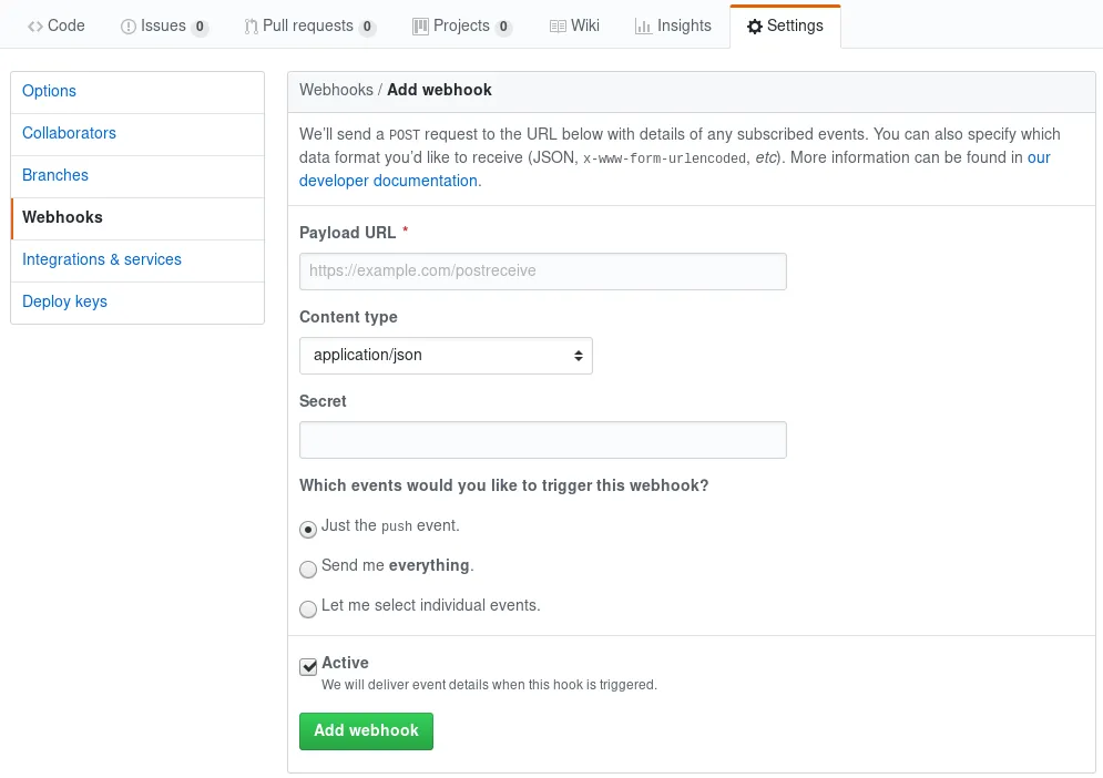 从你的 GitHub 仓库的设置中,选择 Webhook 菜单,并且点击“Add Webhook”。输入以下信息: