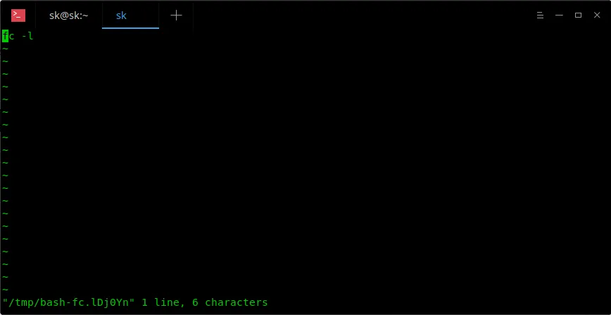 你可以看到,我上一个命令是 fc -l。你可以随意修改,它会在你保存退出编辑器时自动执行。这在命令或参数又长又复杂时很有用。需要注意的是,它同时也可能是毁灭性的。比如,如果你的上一个命令是危险的 rm -fr <some-path>,当它自动执行时你可能丢掉你的重要数据。所以,小心谨慎对待每一个命令。