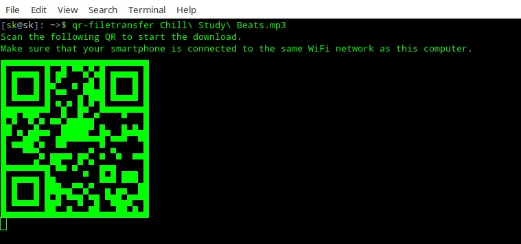 我打算使用 wlp9s0 接口传输文件,因此我输入 “1”。qr-filetransfer 会记住这个选择,除非你通过 -force 参数或删除程序存储在当前用户的家目录中的 .qr-filetransfer.json 文件,否则永远不会再提示你。