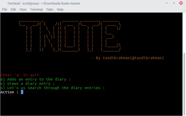 tnote 是一个 Python 脚本。首次启动时,它会要求你输入密码和口令来加密存储笔记的 SQLite 数据库。完成之后,按 A 创建一个笔记。输入你的笔记,然后按 CTRL-D 保存。