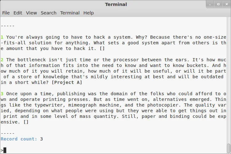 像 tnote 一样,pygmynote 将你的笔记和附件保存在 SQLite 数据库中。当你启动它时,pygmynote 看起来并不特别有用。在任何时候,输入 help 并按下回车键获取命令列表。