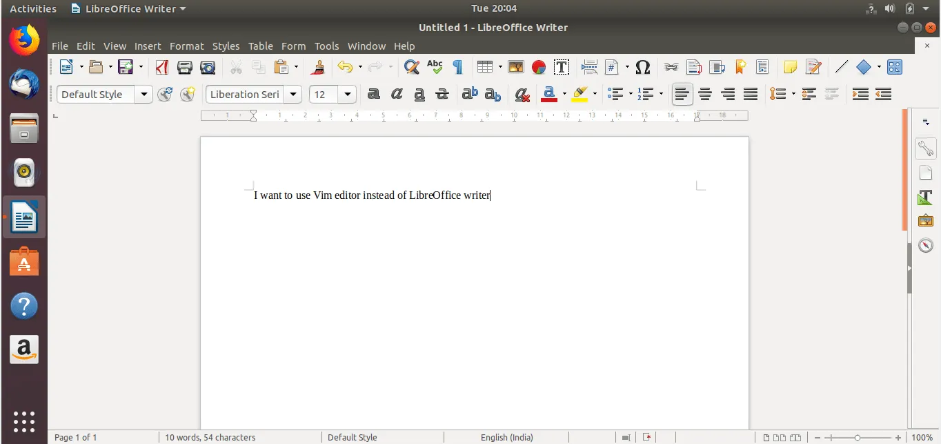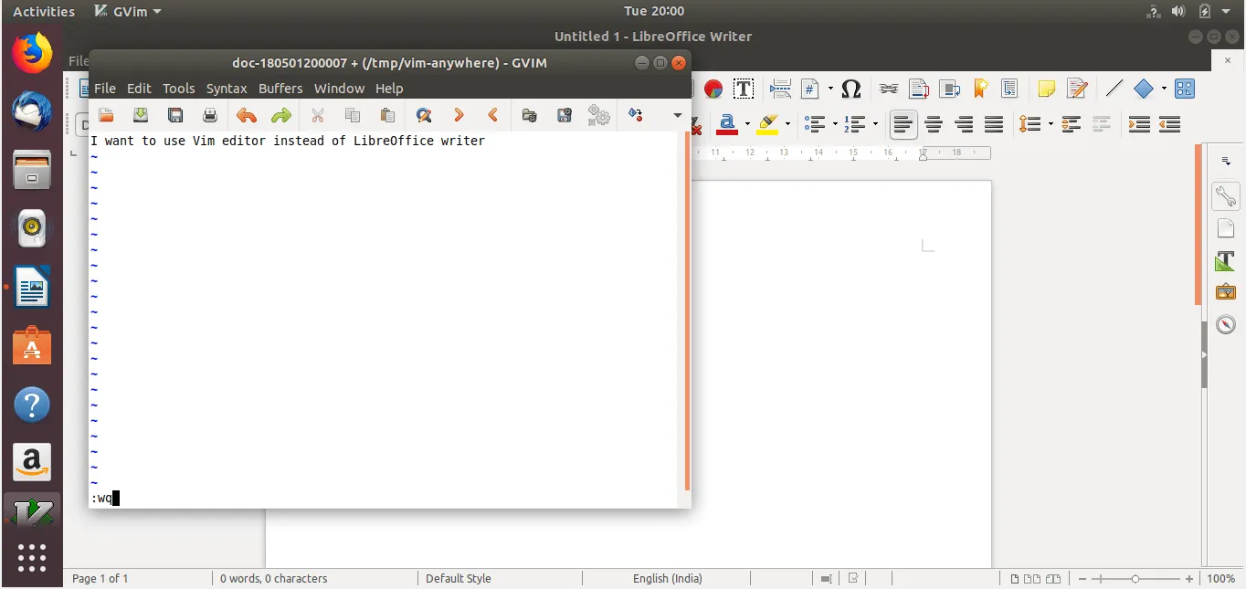 让我给你展示一个用例。打开 LibreOffice 或者你选的任何图形文本编辑器。然后打开 Vim-anywhere。你只需要按下 CTRL+ALT+V 即可。它将会打开 gVim 编辑器。按下 i 切换到交互模式然后输入文本。完成之后,键入 :wq 关闭并保存文件。