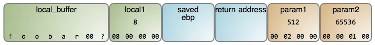 局部变量 local_buffer 是一个字节数组,包含一个由 null 终止的 ASCII 字符串,这是 C 程序中的一个基本元素。这个字符串可以读取自任意地方,例如,从键盘输入或者来自一个文件,它只有 7 个字节的长度。因为,local_buffer 只能保存 8 字节,所以还剩下 1 个未使用的字节。这个字节的内容是未知的,因为栈不断地推入和弹出,除了你写入的之外,你根本不会知道内存中保存了什么。这是因为 C 编译器并不为栈帧初始化内存,所以它的内容是未知的并且是随机的 —— 除非是你自己写入。这使得一些人对此很困惑。