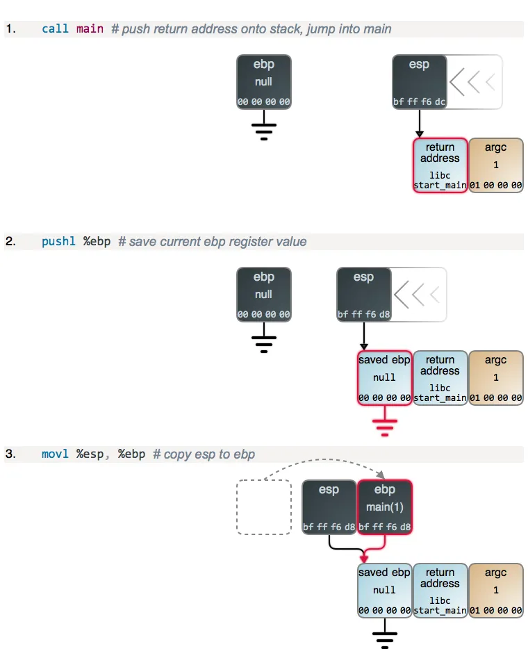 第 2 步和第 3 步,以及下面的第 4 步,都只是函数的 序言 ,几乎所有的函数都是这样的:ebp 的当前值被保存到了栈的顶部,然后,将 esp 的内容拷贝到 ebp,以建立一个新的栈帧。main 的序言和其它函数一样,但是,不同之处在于,当程序启动时 ebp 被清零。
