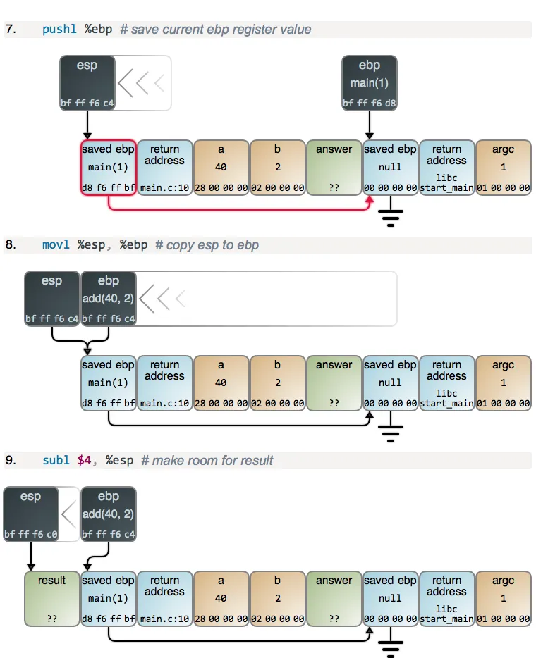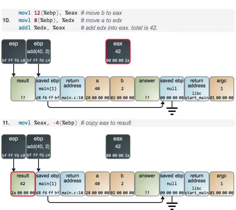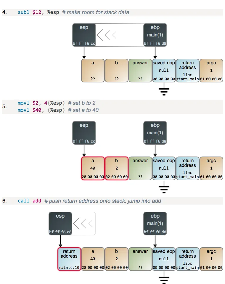 在 main 从 esp 减去 12 之后得到它所需的栈空间,它为 a 和 b 设置值。在内存中的值展示为十六进制,并且是小端格式,与你从调试器中看到的一样。一旦设置了参数值,main 将调用 add,并且开始运行: