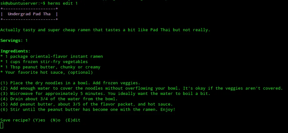 添加完配方的详细信息后,按下 ESC 键并点击 Y 保存。同样,你可以根据需要添加尽可能多的食谱。