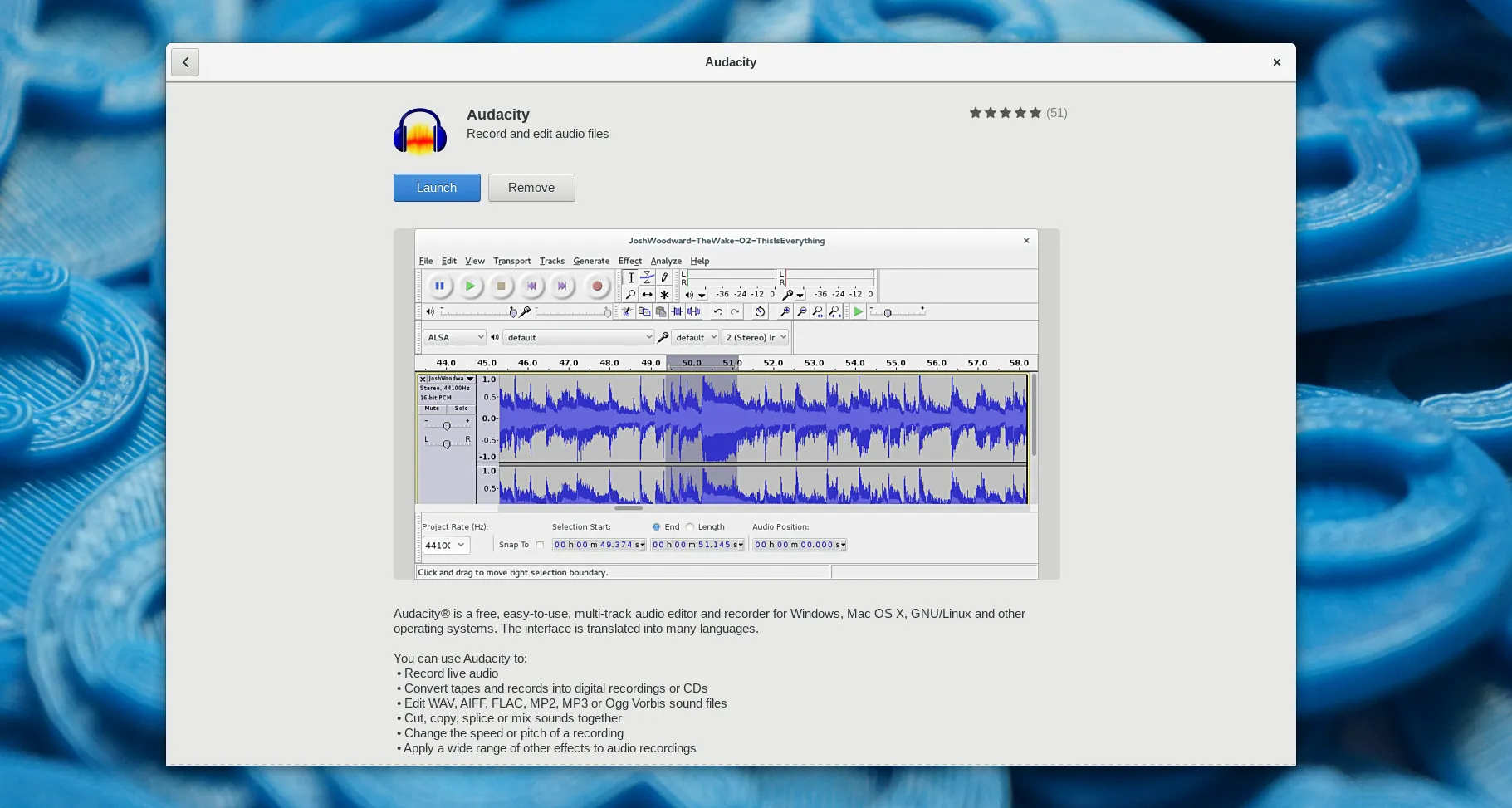Audacity 是 Fedora 中用于混合、剪切和编辑音频文件的程序。在 Fedora 上它支持各种开箱即用的格式 – 包括 MP3 和 OGG。从软件中心安装 Audacity。