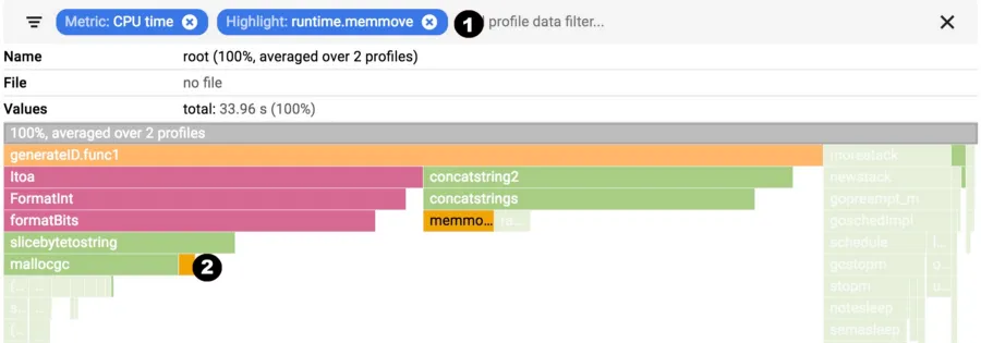 runtime.memmove。 - 火焰将使用过滤器过滤帧并可视化过滤后的框。在这种情况下,它高亮显示所有