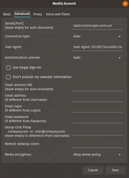 接下来,点击高级选项卡。在 “Server[:Port]” 字段中输入 “sipdir.online.lync.com:443”,在 “User Agent” 中输入 “UCCAPI/16.0.6965.5308 OC/16.0.6965.2117”。