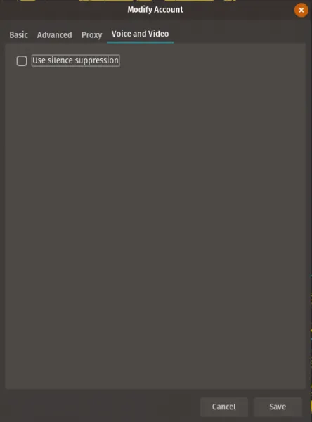 你不需要对“Proxy”选项卡或“Voice and Video”选项卡进行任何更改。只要确定,请确保 “Proxy type” 设置为 “Use Global Proxy Settings”,并且在“Voice and Video”选项卡中,“Use silence suppression” 复选框为取消选中。