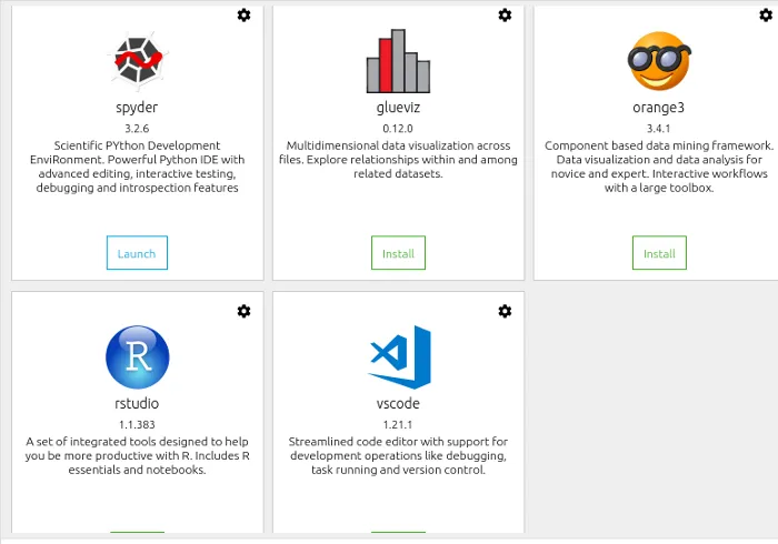 我习惯使用的 RStudio 并没有默认安装,但安装它也仅需点击一下鼠标。其它应用的启动或安装也仅需点击一下鼠标,包括 JupyterLab、 Orange、 Glue 和 Spyder 等。