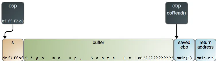 上面的代码中使用了 gets 从标准输入中去读取内容。gets 持续读取直到一个新行或者文件结束。下图是读取一个字符串之后栈的示意图: