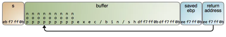 最后,攻击者重复猜测几次返回地址,这将再次提升他们的胜算。以 4 字节为界进行多次重复,它们就会更好地覆写栈上的原始返回地址。