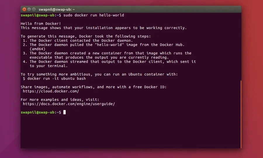 PS C:Usersswapnil> docker run hello-world