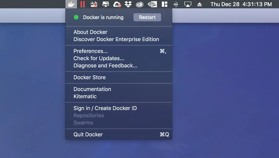 你可以在 macOS 和 Windows 上很轻松地安装 Docker CE(和 EE)。下载官方为 macOS 提供的 Docker 安装包,在 macOS 上安装应用程序的方式是只需将它们拖到 Applications 目录即可。一旦文件被复制,从 spotlight(LCTT 译注:mac 下的搜索功能)下打开 Docker 开始安装。一旦安装,Docker 将自动启动,你可以在 macOS 的顶部看到它。