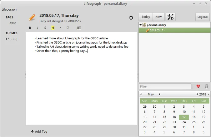 Lifeograph 与 RedNotebook 有相似的外观和感觉。它没有那么多功能,但 Lifeograph 也够了。