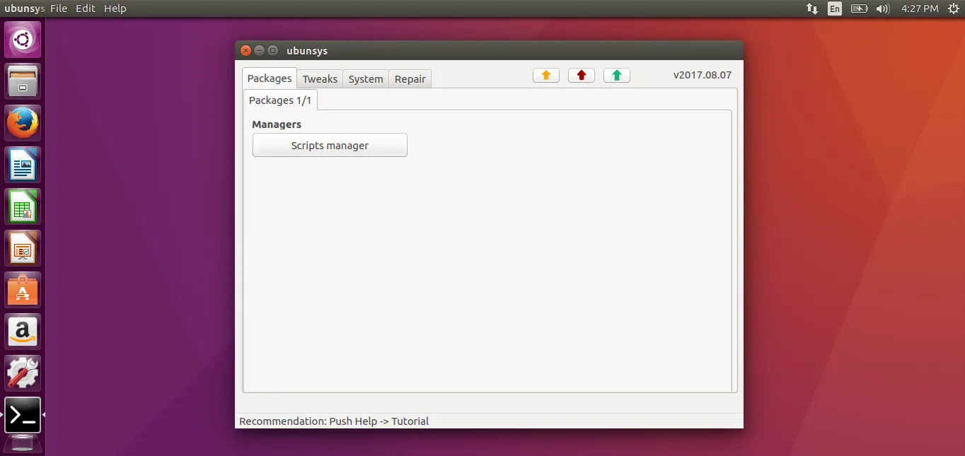 你可以看到,Ubunsys 有四个主要部分,分别是 Packages、Tweaks、System 和 Repair。在每一个标签项下面都有一个或多个子标签项以对应不同的操作。
