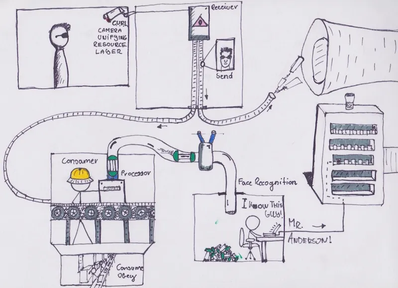 这是一个人脸识别服务,通过比较已知个人的图片,识别给定图片对应的个人。前端页面用表格形式简要的展示图片及对应的个人。具体而言,向 接收器 发送请求,请求包含指向一个图片的链接。图片可以位于任何位置。接受器将图片地址存储到数据库 (MySQL) 中,然后向队列发送处理请求,请求中包含已保存图片的 ID。这里我们使用 NSQ 建立队列。