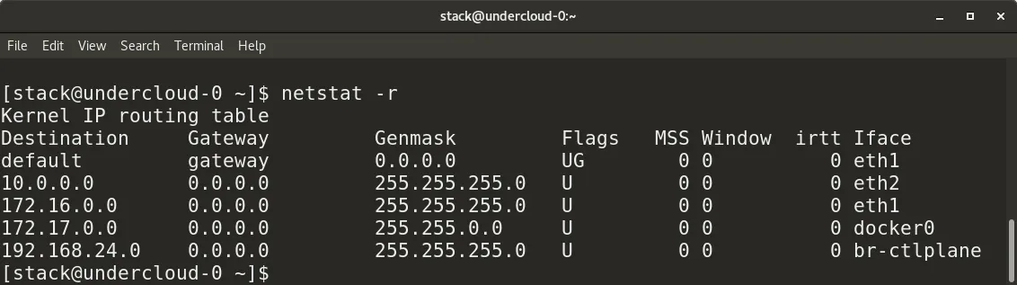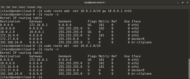 route add default gw <gateway-ip>在路由表中添加一个默认的网关。route add -net <network ip/cidr> gw <gateway ip> <interface>在路由表中添加一个新的网络路由。还有许多其它的路由参数,比如,添加一个默认路由,默认网关等等。route del -net <network ip/cidr>从路由表中删除一个指定的路由条目。