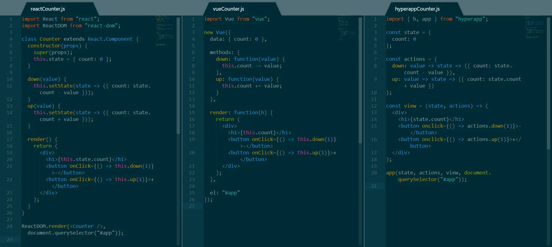 • React 更推崇面向对象的范式,就是创建一个 Counter 组件的 class。Vue 遵循类似的范式,通过创建一个新的 Vue 类的实例并将信息传递给它来实现。最后,Hyperapp 坚持函数范式,同时完全彼此分离 viewstateaction