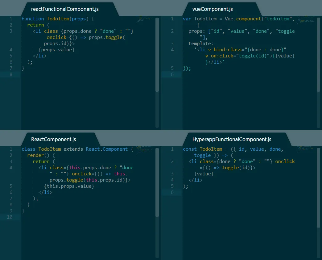 via: https://hackernoon.com/javascript-framework-comparison-with-examples-react-vue-hyperapp-97f064fb468d