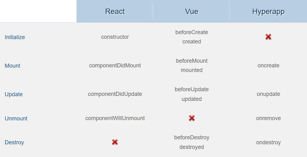 • React 和 Hyperapp 的生命周期钩子非常类似,React 将 unmountdestory 绑定在了一起,而 Hyperapp 则将 createmount 绑定在了一起。两者在处理生命周期事件方面都提供了相当多的控制。