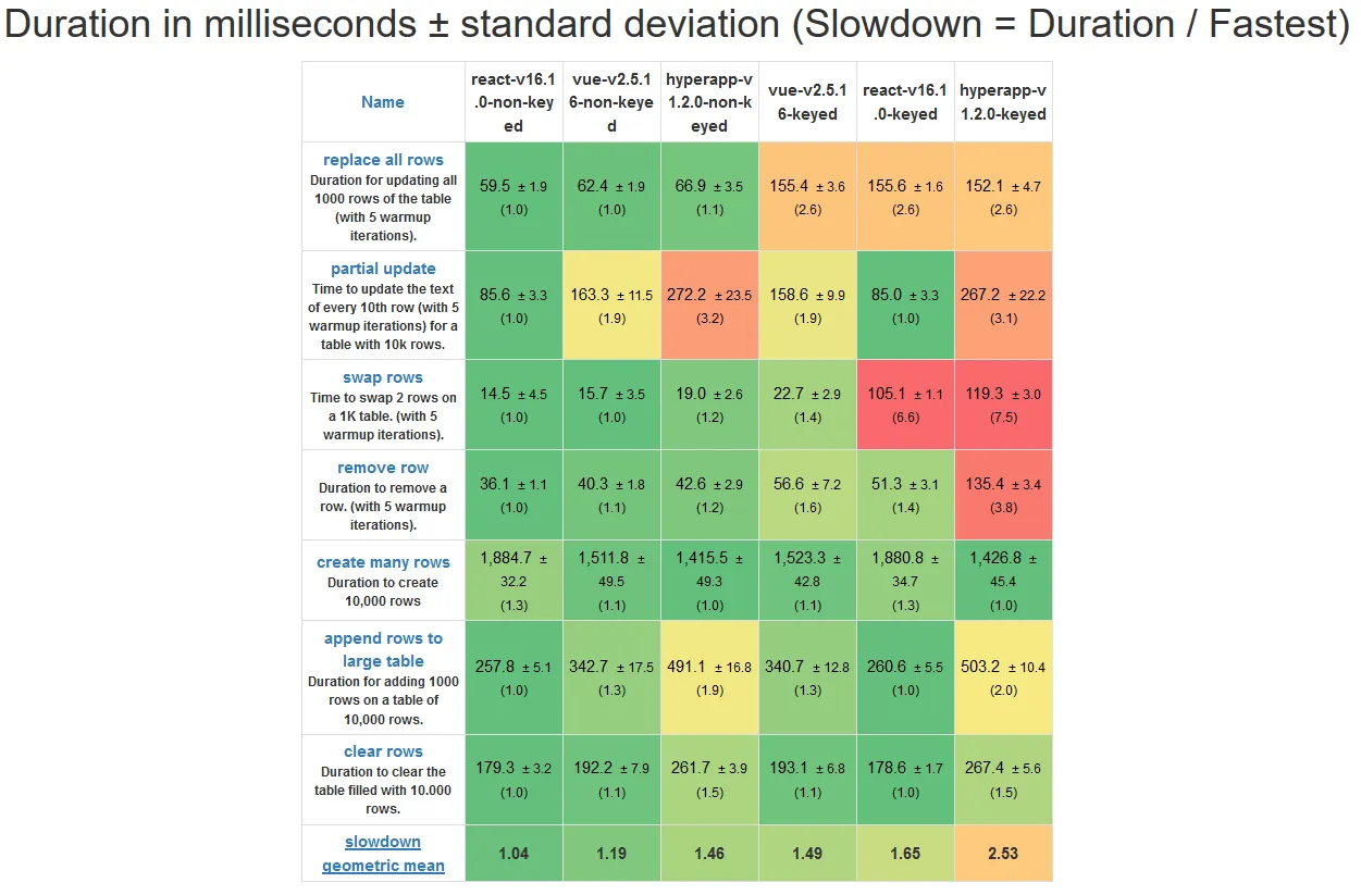 除了易用性和编码技术以外,性能也是大多数开发人员考虑的关键因素,尤其是在进行更复杂的应用程序时。js-framework-benchmark 是一个很好的用于比较框架的工具,所以让我们看看每一组测评数据数组都说了些什么: