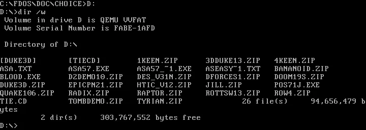 在 DOS 下切换磁盘很容易。只要在命令行输入盘符后附加一个冒号(:),然后 DOS 就会切换到该工作磁盘。举例来说,在我的 QEMU 系统上,我将 D: 设置到我的 Linux 主目录下的一个共享目录,那里存放了各种我想测试的 DOS 应用程序和游戏的安装文件。