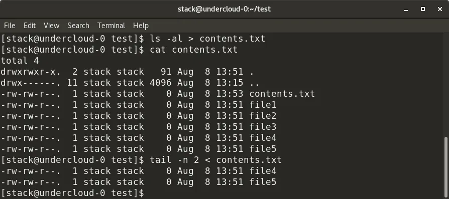 如上所示,ls -al 命令的输出被重定向到 contents.txt 并插入到文件中。类似地,tail 命令的输入通过 < 符号从 contents.txt 读取。