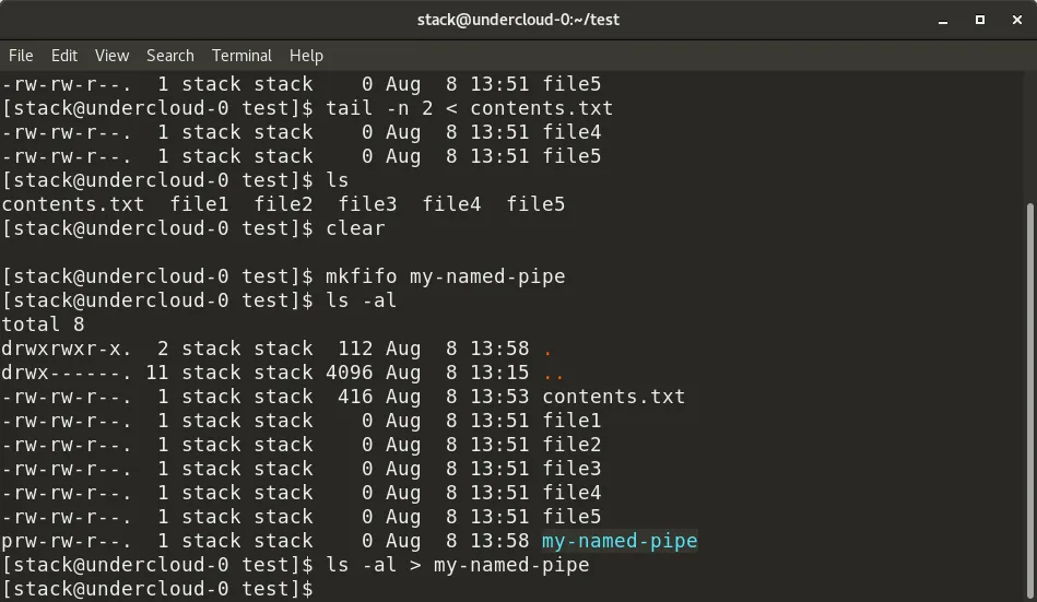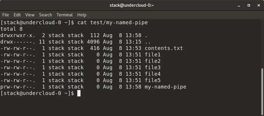 这里,我们创建了一个命名管道 my-named-pipe,并将 ls -al 命令的输出重定向到命名管道。我们可以打开一个新的 shell 会话并 cat 命名管道的内容,如前所述,它显示了 ls -al 命令的输出。请注意,命名管道的大小为零,并有一个标志 “p”。